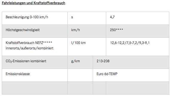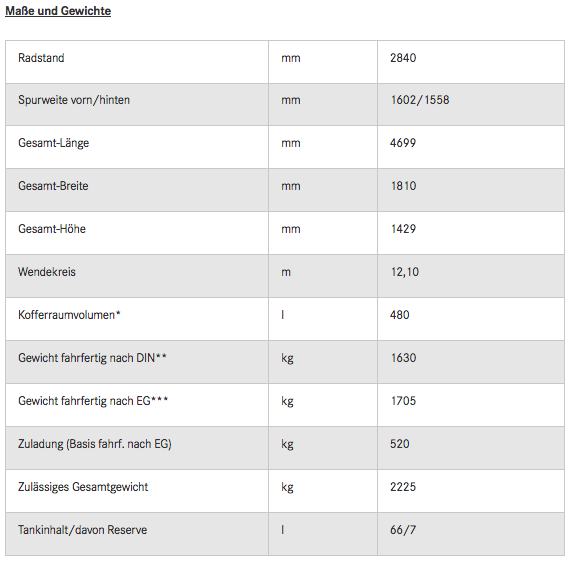 *nach VDA-Messmethode;** Leergewicht fahrfertig nach DIN ohne Fahrer; *** Leergewicht fahrfertig nach EG inklusive Fahrer (75 kg); **** elektronisch abgeregelt; *****Die angegebenen Werte wurden nach dem vorgeschriebenen Messverfahren ermittelt. Es handelt sich um die NEFZ-CO2-Werte i.S.v. Art. 2 Nr. 1 Durchführungsverordnung (EU) 2017/1153. Die Kraftstoffverbrauchswerte wurden auf Basis dieser Werte errechnet