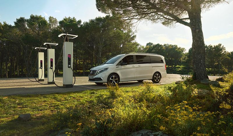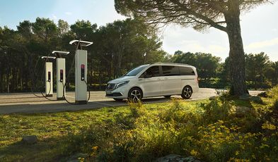 Mit dem MBUX Multimediasystem steht in Verbindung mit einem Mercedes me Account[6],[7] zudem eine Vielzahl von digitalen Extras zur Verfügung. Sie machen den EQV noch intelligenter – und den Alltag noch einfacher und effizienter. Vor und nach der Fahrt oder auch von unterwegs lassen sich verschiedene Funktionen nutzen. Dazu gehören die kostenlosen Dienste wie Wartungs-, Unfall- und Pannenmanagement sowie die Remote-Dienste wie das Ver- und Entriegeln der Türen und das Öffnen und Schließen der Fenster über die Mercedes me App. Weitere hilfreiche Dienste sind unter anderem die Navigation mit Live Traffic Information, die Car-to-X-Kommunikation und die erweiterten MBUX Funktionen mit dem Sprachassistenten „Hey Mercedes“. Er kann auf Wunsch zum Beispiel online nach Restaurants oder Hotels in der Nähe suchen. Zusätzlich können Kunden erstmals die Satellitenansicht nutzen; Privatkunden haben zudem nun die Möglichkeit, ihren Standort oder ihre errechnete Ankunftszeit mit ihren Kontakten dank der Social Navigation zu teilen. Für den EQV steht außerdem der digitale Service Mercedes me Charge[8] zur Verfügung. Er bietet Kundinnen und Kunden Zugang zu einem der größten öffentlichen Ladenetzwerke in Europa mit über 500.000 Ladepunkten – inklusive dem europäischen Schnellladenetz IONITY. An allen Stationen ermöglicht Mercedes me Charge das Laden mit Strom aus erneuerbaren Quellen[9].
