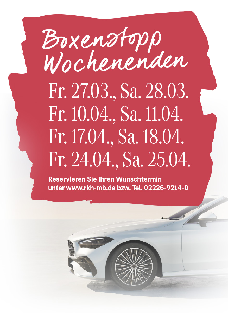 Wir wechseln Ihre Räder in Rekordzeit! Sie haben an den folgenden „Boxenstopp-Wochenenden“ keine Zeit? Kein Problem! Vereinbaren Sie jetzt Ihren Wunschtermin hier direkt online bzw. unter 02226-9214-0