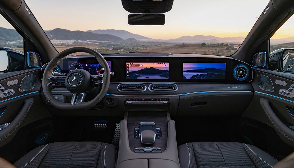 Mit dem serienmäßigen MBUX Superscreen hält die digitale Welt Einzug in den GLS. Unter einer großen Glasfläche sitzen drei jeweils 31,2 Zentimeter (12,3 Zoll) große Displays. Auf dem MBUX Zero Layer werden die wichtigsten Informationen und Empfehlungen in der konfigurierbaren Fußleiste angezeigt. Zudem können Nutzerinnen und Nutzer ihre Apps nach Belieben ordnen und in selbstbenannten Ordnern gruppieren, sodass jede Bedienung ein höchst persönliches Erlebnis wird. Über 40 Apps können aktuell genutzt werden, darunter Audio, Video, Gaming und weitere Services.
