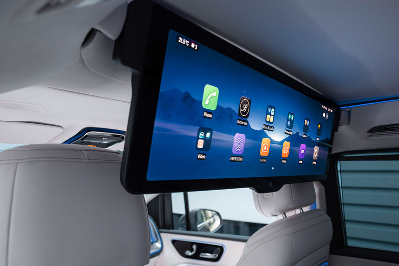 Der VLE verwöhnt seine Fahrgäste mit einem außergewöhnlichen MBUX Fond-Erlebnis (optional). Versteckt im Dachhimmel über den Frontsitzen befindet sich ein ausfahrbarer, 79 Zentimeter (31,3 Zoll) großer Panorama-Screen mit Splitscreen-Funktion. Per Sprachbefehl wie „Hey Mercedes, starte das Kinoerlebnis“ gleitet er aus seiner „Garage“. Gleichzeitig fahren die elektrischen Sitze in eine komfortable Position und die Fensterrollos schließen. Der Bildschirm erwacht zum Leben und verwandelt den Innenraum in einen individuellen Rückzugsort, der als Kino, Gaming-Hub, Konzertsaal, mobiles Büro oder Oase der Entspannung dienen kann.